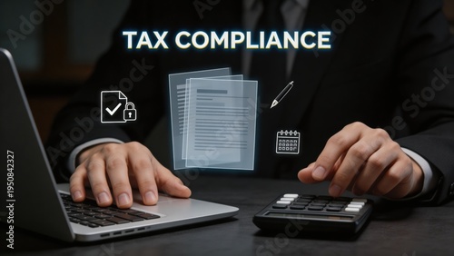 Business professional calculating tax with laptop and calculator, digital tax interface overlay, symbolizing tax planning, accounting services, compliance, and financial management for companies.