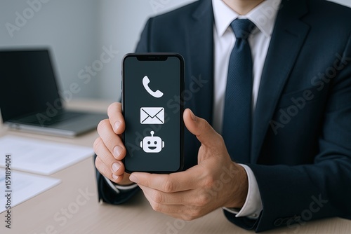 Business Professional Man in Suit Holding Smartphone with Call Email and Chat Icons.