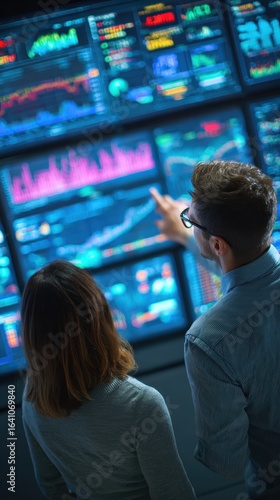Business professionals analyzing financial data trends on multiple screens in a modern office environment with vibrant graphs and charts illuminating their discussion