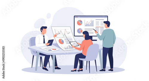 Business professionals collaborating on data analysis project in a modern office setting with various visual aids and technology