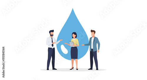 business, professional, water, conservation, discussion, teamwork, sustainability, environment, eco, friendly, droplet, icon, meeting, colleague, colleague, office, work, people, three, group, blue, large, symbol, graphic, illustration, cartoon, vector, flat, design, concept, idea, communication, collaboration, partnership, strategy, planning, solution, resource, management, environmentally friendly, green, planet, earth, save, protection, preservation, reusing, recyclable, reduce