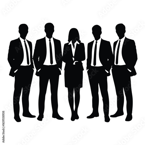 business, professional, group, silhouette, man, woman, suit, tie, teamwork, corporate, office, meeting, presentation, success, leadership, diversity, collaboration, black-and-white, vector, illustration, clean, modern, partnership