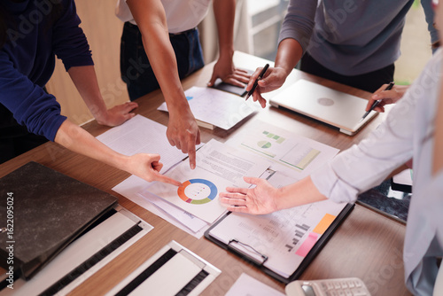 Business professionals team analyzing data charts discussing reports collaborating strategizing for growth in a modern office workspace