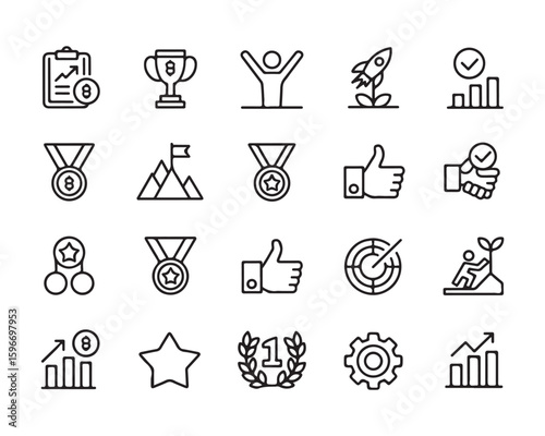 achievement, success, growth, business, award, medal, trophy, star, graph, chart, rocket, launch, target, goal, thumb, up, handshake, victory, succeed, concept, icon, set, collection, outline, symbol, competition, leadership, strategy, development
