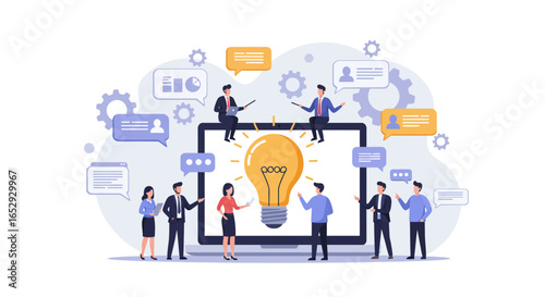Business teamwork and brainstorming illustration. A large laptop with a glowing light bulb on the screen represents innovation and new ideas. Around the laptop are diverse professionals in business at