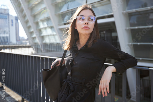 Business woman portrait in city streets at sunset. Sexy brunette wearing black dress, glasses and black leather bag