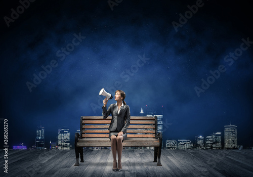 Business woman with megaphone on wooden bench