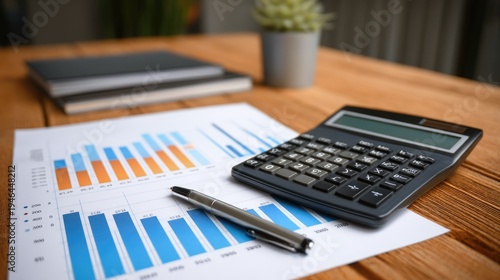 Business workspace featuring financial charts, calculator, pen, and notebook on wooden desk, ideal for accounting, analysis, and financial planning themes