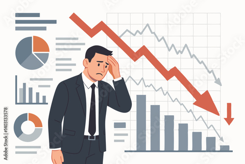 Businessman Analyzing Financial Crisis with Declining Graphs, Charts, and Economic Data Representation in Corporate Setting