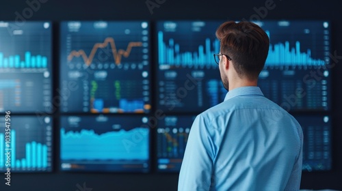 Businessman analyzing financial data on multiple screens in a dark office. Concept of finance, data analysis, and modern technology.