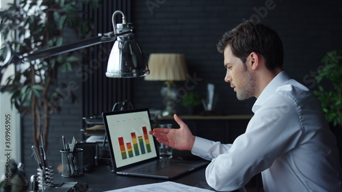 Businessman analyzing graphs on laptop screen in office. Man working on laptop