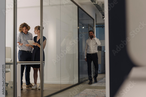 Businessman and businesswoman using tablet in office with businessman on the phone passing by