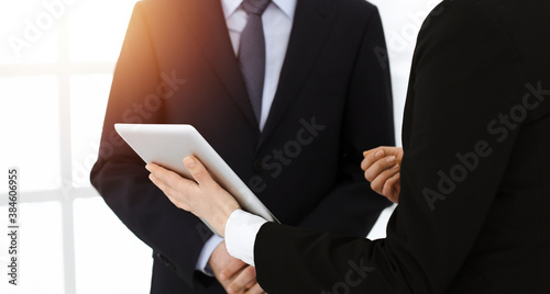 Businessman and woman using tablet computer for discussing questions in sunny office. Partners or colleagues at meeting. Cooperation concept