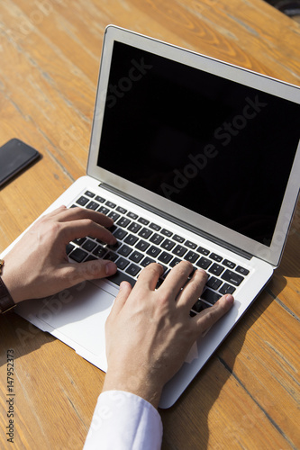 Businessman at work. Close-up top view of man typing on laptop