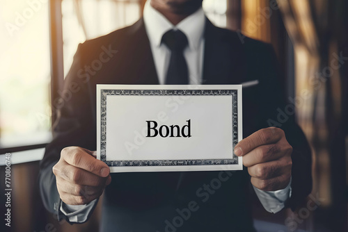 Businessman behind hold bond certificate with word “Bond”, investing in bonds concept