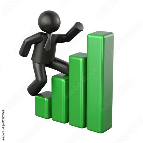 businessman, climbing, bar, graph, success, growth, progress, achievement, career, business, three-dimensional, illustration, finance, investment, marketing, sale, profit, increase, development, opportunity, ambition, goal, target, leadership, strategy, future, ascending, rising, positive, upward, trend, green, bar, black, figure