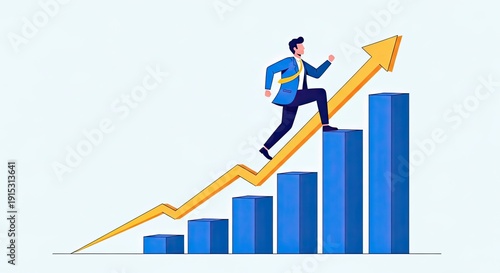 Businessman climbing upward graph with rising arrow symbolizing progress and growth in business