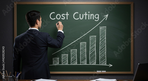 Businessman drawing cost cutting graph on chalkboard showing upward trend green board chalk