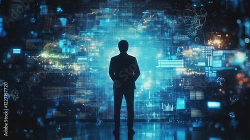businessman, silhouette, datum, visualisation, wall, digital, information, technology, future, innovation, network, interface, screen, graphic, code, programming, chart, graph, statistic, number, pattern, trend, analysis, big, ai, artificial, intelligence, machine, learning, system, computing, global, earth, map, connection, communication, security, privacy, business, finance, market, growth, strategy