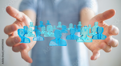 Businessman holding 3D rendering group of blue people