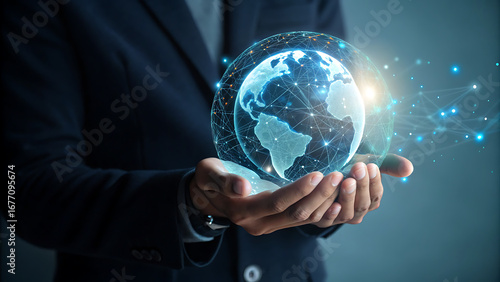 Businessman holding a glowing digital globe representing global connectivity and technological advancement