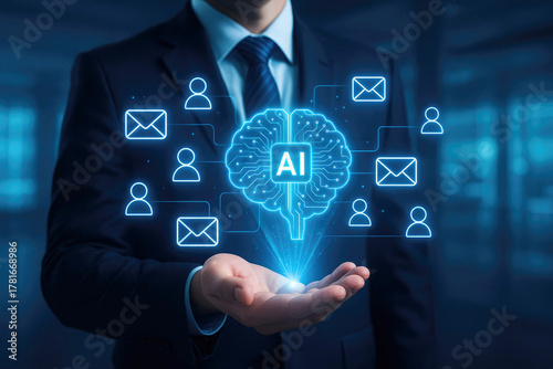 artificial intelligence, ai, brain, hologram, businessman, suit, technology, digital, network, connection, user, icon, electronic mail, symbol, communication, datum, information, science, futuristic, innovation, concept, intelligence, virtual, display, hand, palm, holding, glowing, blue, corporate, business, strategy, development, system, software, analysis, insight, artificial