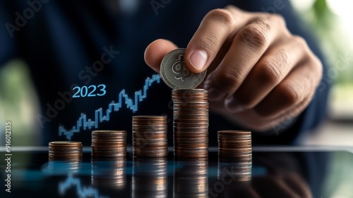 Businessman holding coins and a rising graph or chart of finances on a virtual screen for a business idea, investment concept of accumulating money in the year "2023" and saving to a bank