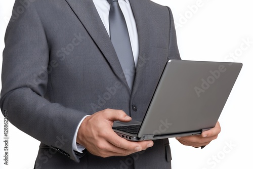 man, suit, grey, laptop, hand, business, professional, technology, computer, office, work, holding, textured, clothing, male, isolated, portrait, closeup, formal, modern, corporate, digital, workplace, professionalism, equipment, portable, communication, focused, neutral, white, background, bright, even, lighting, midsection, attire, wear, meeting, working, presentation, businessman