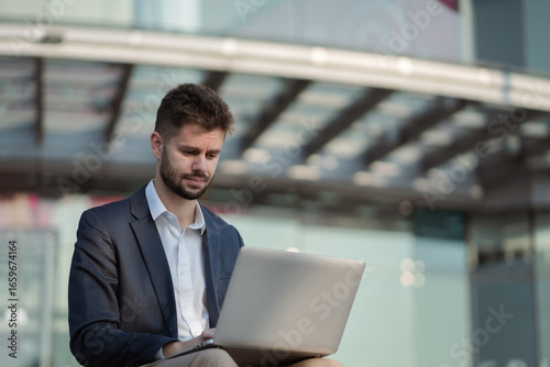 businessman, career, confident, adviser, person, corporate, employer, executive, finance, cyberspace, job, laptop, notebook, outside, professional, project, senior, smile, standing, success, successful, suit, using, men at work, working, looking, office, smiling, work, business, communication, computer, male, happy, modern, portrait, technology, urban, man, adult, attractive, beauty, asian, background, beautiful, city, street