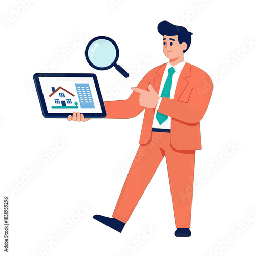 Businessman holding tablet with real estate illustration