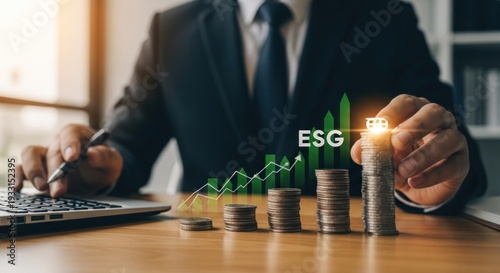 Businessman illustrating ESG investment growth with coins, graph, and laptop