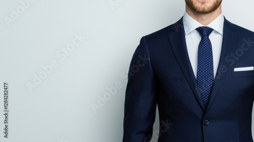 Businessman in navy suit against a light gray background. Possible use Business professional, career, success