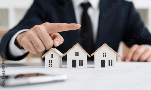 Businessman indicating choice among miniature houses on desk.