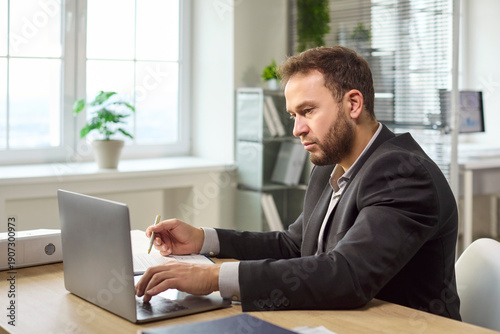 Businessman man in office with laptop. Focused professional at work on planning and analysis, managing tasks and aligning strategy in a workspace. Concept conveys focus and business planning.