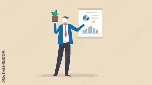 Businessman presenting charts while holding a plant in a pot for growth presentation