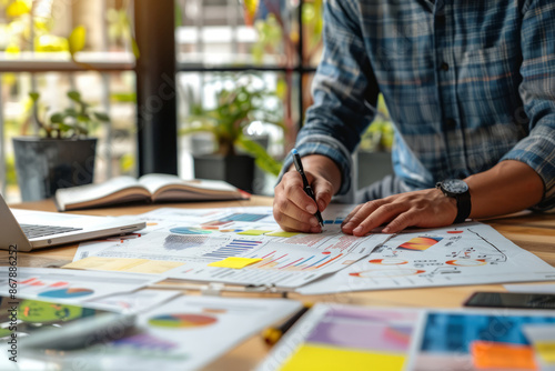 Businessman reviewing and analyzing financial charts and graphs at a desk in a bright office