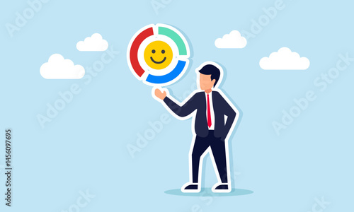 Businessman showing circle chart with happy emoticon inside illustration of diversification classification or distribution of market attention rate to business