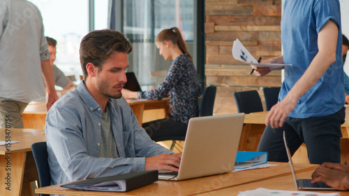 Businessman Sitting At Desk Working On Laptop In Busy Open Plan Office