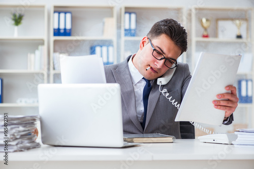 stress, man, male, businessman, antismoking, smoking, anti, abuse, addict, addicted, addiction, bad, ban, break, cancer, cigarette, cigarette, danger, habit, health, nicotine, no, non, person, prohibited, prohibition, quit, quitting, risk, smoke, smoker, stop, tobacco, unhealthy, office, stressed, frustrated, overworked, phone, phone, landline, talking, calling, work, laptop, computer, notebook