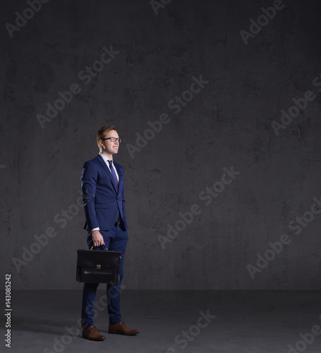Businessman standing over dark wall background. Business, career job concept.