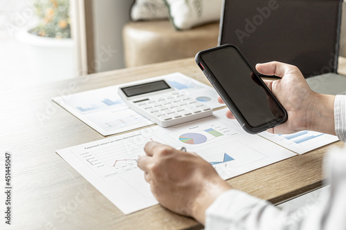 Businessman talking to a partner in a smartphone app, he is checking the accuracy of company financial data, financial status documents in line and pie charts. Finance concept.