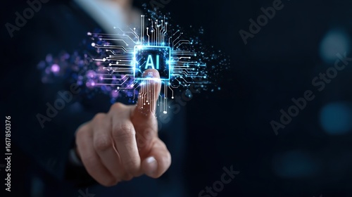 Businessman Touching Cyberpunk AI Circuit Board Icon with Neon Lighting, Symbolizing Artificial Intelligence, Machine Learning, and Futuristic Technology Innovation