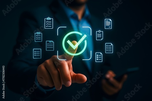 Businessman Touching Digital Checkmark for Task Approval and Verification Concept