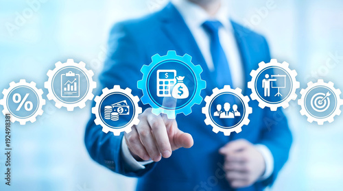 Businessman touching financial management gear interface for budget planning and investment strategy