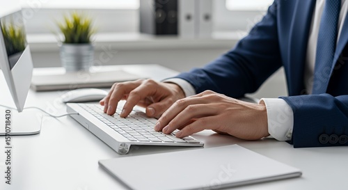 businessman, typing, keyboard, desk, office, computer, mouse, notepad, suit, white, clean, modern, workspace, technology, professional, business, work, job, employee, executive, manager, corporate, occupation, career, employment, hand, finger, key, screen, monitor, plant, indoor, interior, table, surface, document, paper, formal, attire, clothing, jacket, sleeve, cuff, buttons, attaching, blue, green, sharpened, blur