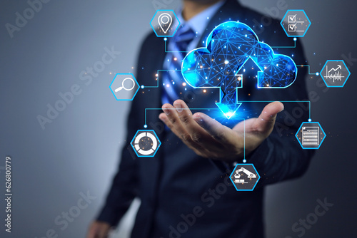 Businessman use his hand to receive data from the cloud represent to upload and download data to use business information planning strategy for profit with cloud computing and data transformation