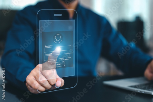 Businessman use laptop login username and password identity or sign up register concepts of cyber security, internet access, join social or personal data protection or forget pass key unlock.