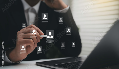 Businessman using digital pen to select candidate profile icons on laptop representing recruitment human resources hiring process and talent acquisition concept in modern business environment