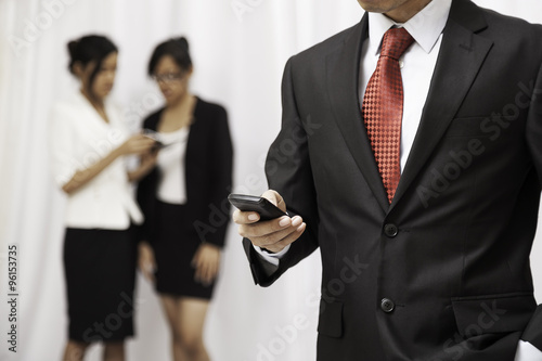 businessman using his mobile phone while two women are talking in the background