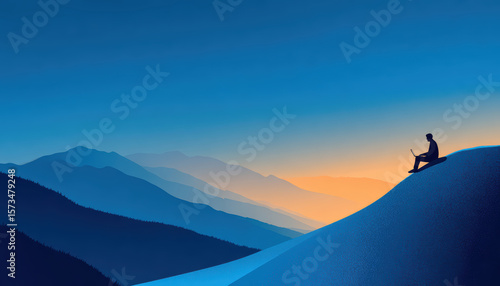 businessman, mountain, laptop, sunset, freedom, nature, working, sitting, peak, landscape, success, achievement, inspiration, motivation, ambition, technology, wireless, cyberspace, connection, communication, entrepreneur, business, career, travel, adventure, outdoors, solitude, peace, calmness, serenity, sky, cloud, dusk, twilight, evening, view, scenic, panorama, horizon, mountain chain, vale, silhouette, blue, orange, gradient, graphic, illustration